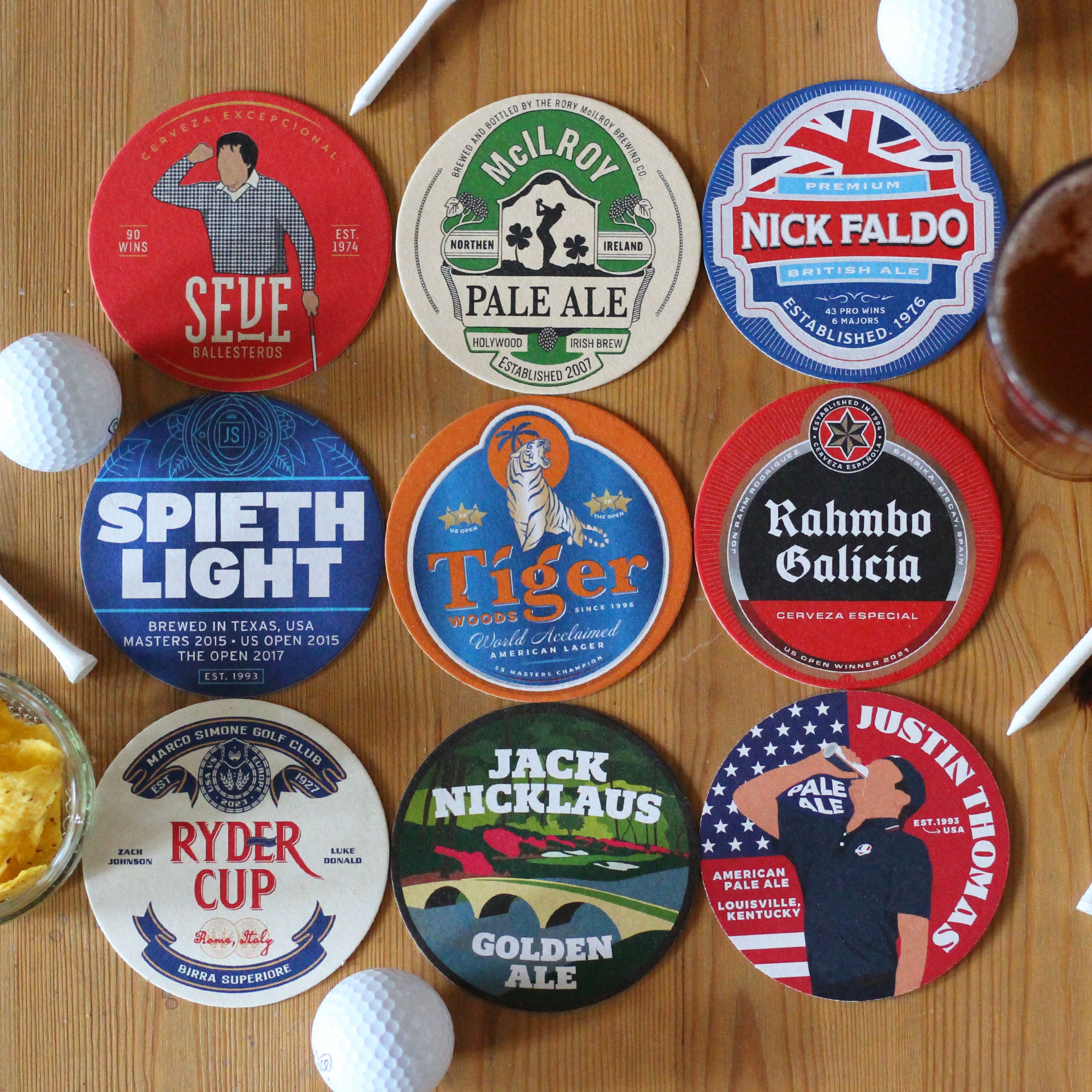 Each pack of beer mats contains 9 unique designs inspired by golf's biggest names, both past and present. Printed on traditional pulp, our mats give you the authentic look and feel of a beer mat from the local.